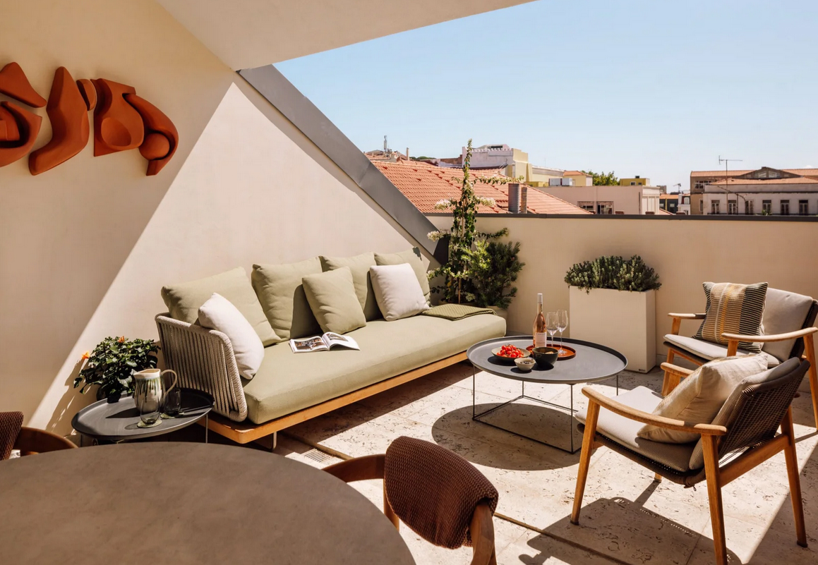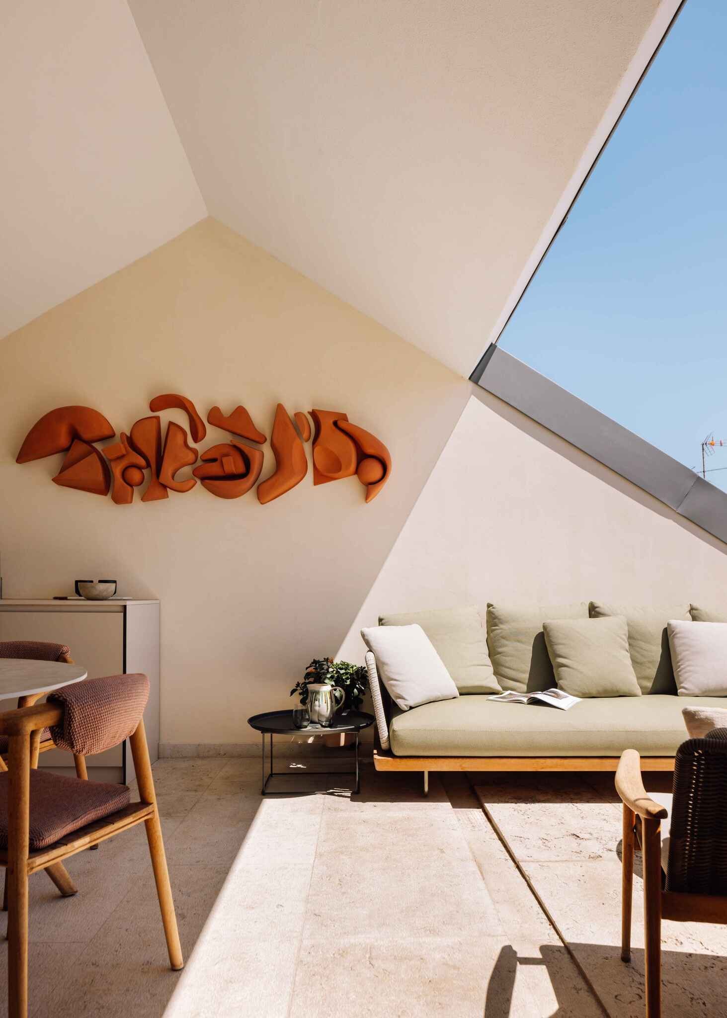 Architectural project signed by Federico Valsassina, in a Portuguese style with pine floors and white walls. Maison Amarande decided to add touches of terracotta colour, respecting the architect’s style and specificly with a terracotta wall installation.