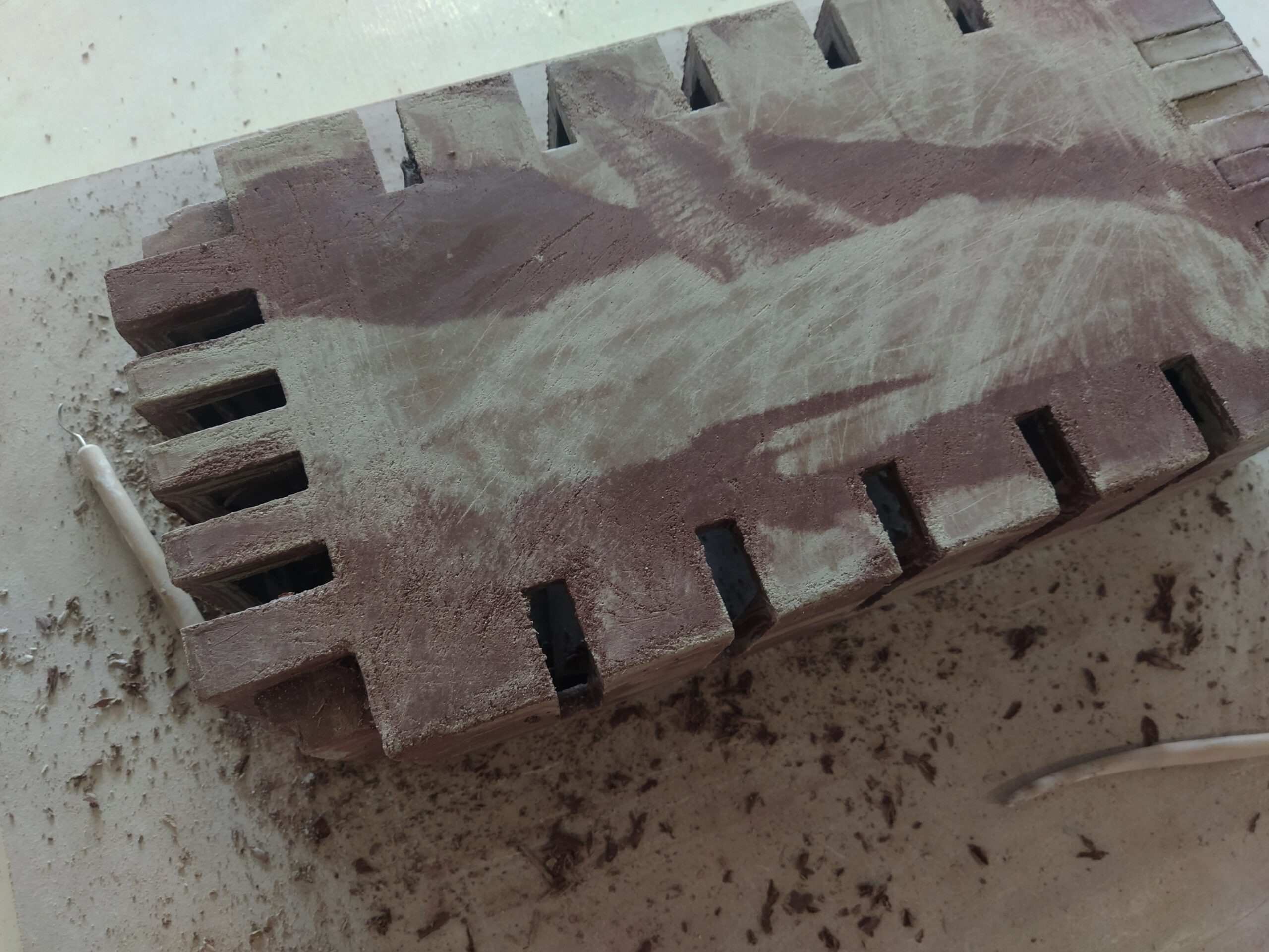 A limited edition of eight sconces, crafted by marbling two different clays and inspired by brutalist architecture. This series was created for a project by Studio Mortazavi, an architectural design agency based in San Francisco, Lisbon, and Paris.