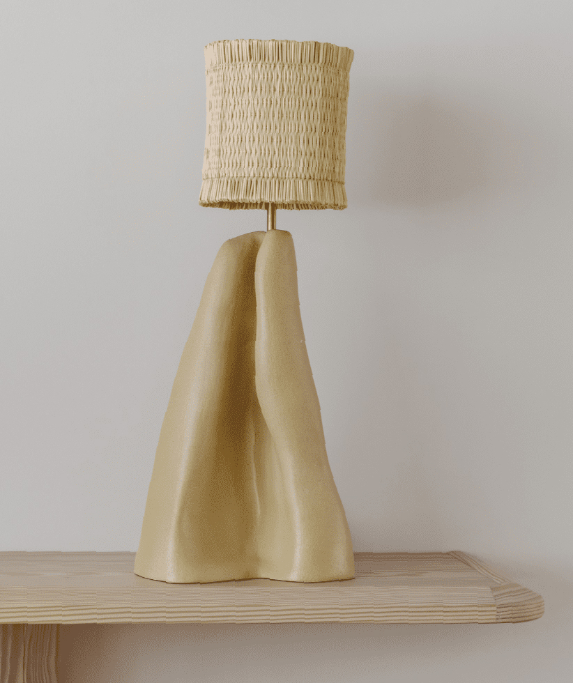 Ombra table lamp is sculpted from stoneware, featuring anthropomorphic or organic shapes reminiscent of draped fabric or natural curves. Originally made for Flores Textile Studio.